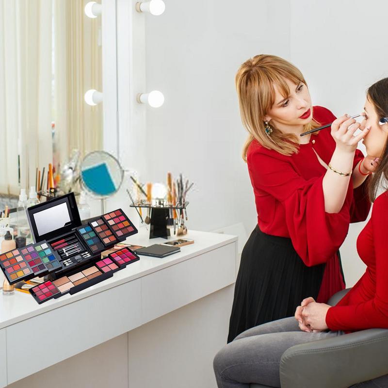 This all-in-one makeup case contains lip gloss, eyeshadow, lipstick, brow powder, brushes, and more. A makeup box can achieve multiple styles of full-face makeup to meet your different needs.
